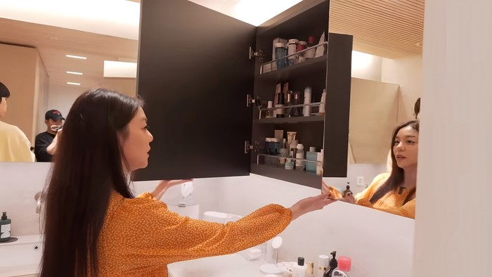 Kontras dengan kamar mandi tamu yang serba hitam, kamar mandi utama di rumah Ailee dan Choi Si Hun memiliki nuansa lebih terang. Ruang untuk kamar mandi dimaksimalkan fungsinya melalui pemilihan desain interior, salah satu contohnya adalah laci penyimpanan produk perawatan yang juga berfungsi sebagai cermin.
