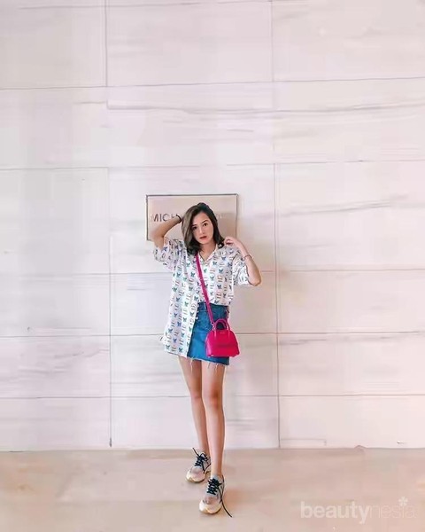 Artis, penyanyi dan model asal Indonesia ini juga layak dikategorikan ke dalam deretan selebriti Indonesia yang kerap kali berpenampilan ala Korean Style. Skirt jeans serta blouse dengan motif lucu tersebut merupakan kombinasi yang sangat pas untuk kategori Korean Style 2018. Tas dengan warna berani tersebut menambah keeleganan Beby pada penampilannya kali ini. Tak lupa pula dengan sneaker dengan tali hitam yang dipakainya.