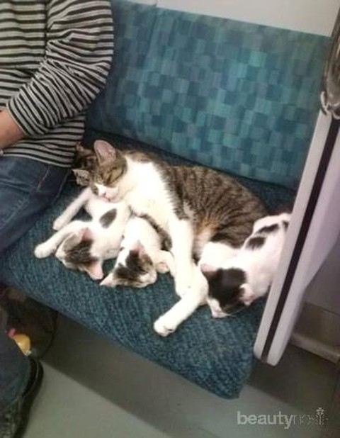 Biasanya hanya manusia yang terlihat naik kereta. Kali ini seekor ibu kucing membawa anak-anaknya bepergian!