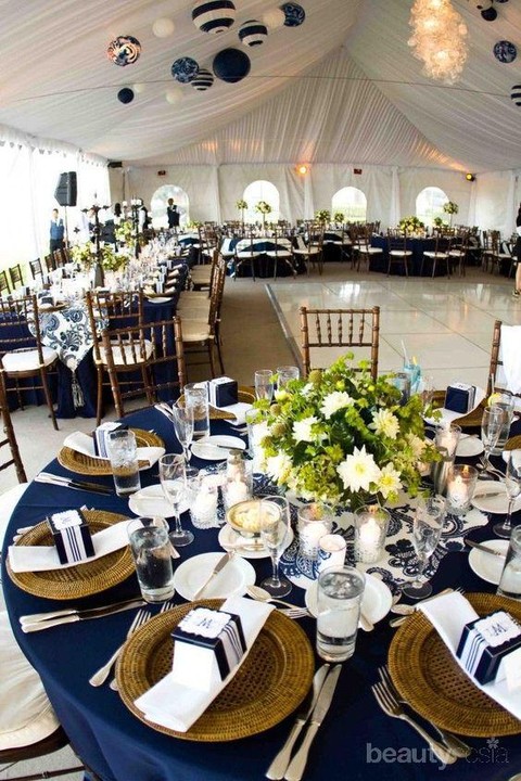 Navy Blue merupakan salah satu warna tegas yang biasa kita temui di bahan bahan jeans, dan cenderung ada pada warna pakaian casual. Namun ternyata, jika dipadu padankan dengan warna yang sesuai, akan memberikan kesan elegan. Jika kamu menginginkan dekorasi yang tegas, elegan dan tentunya terlihat formal, kamu bisa nih menggunakan tema warna ini sebagai pilihan warna dekorasi di hari spesialmu. Paduan warna navy blue dengan warna gold atau putih, akan menghasilkan paduan yang cantik untuk dekorasi pernikahan kamu. Tema warna ini sangat cocok diaplikasikan pada tema di dalam gedung atau tema outdoor. So, masih takut menggunakan warna warna tegas dalam dekorasi pernikahanmu? Gak lah yaa, selama kita mampu memadu padankan dengan warna yang sesuai, dijamin warna dekorasi pernikahanmu, jadi pernikahan yang sangat elegan.