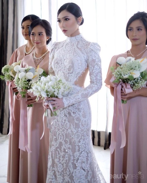 Bagian punggung yang terbuka ditutupi dengan veil tulle putih yang disangkutkan di sanggul Isyana. Ia tampak makin cantik, seksi, dan elegan. Gaun ini juga berhasil mencuri perhatian tamu undangan yang hadir.