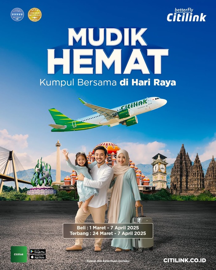Masih mencari tiket mudik untuk naik pesawat? Kamu bisa memanfaatkan promo dari maskapai penerbangan Citilink. Citilink menurunkan harga penerbangan domestik mulai dari Rp 700.000-an, Beauties. Promo mudik hemat berlaku untuk pembelian 1 Maret-7 April dan untuk penerbangan 24 Maret-7 April 2025. Pembelian tiket berlaku di citilink.co.id atau aplikasi Citilink.