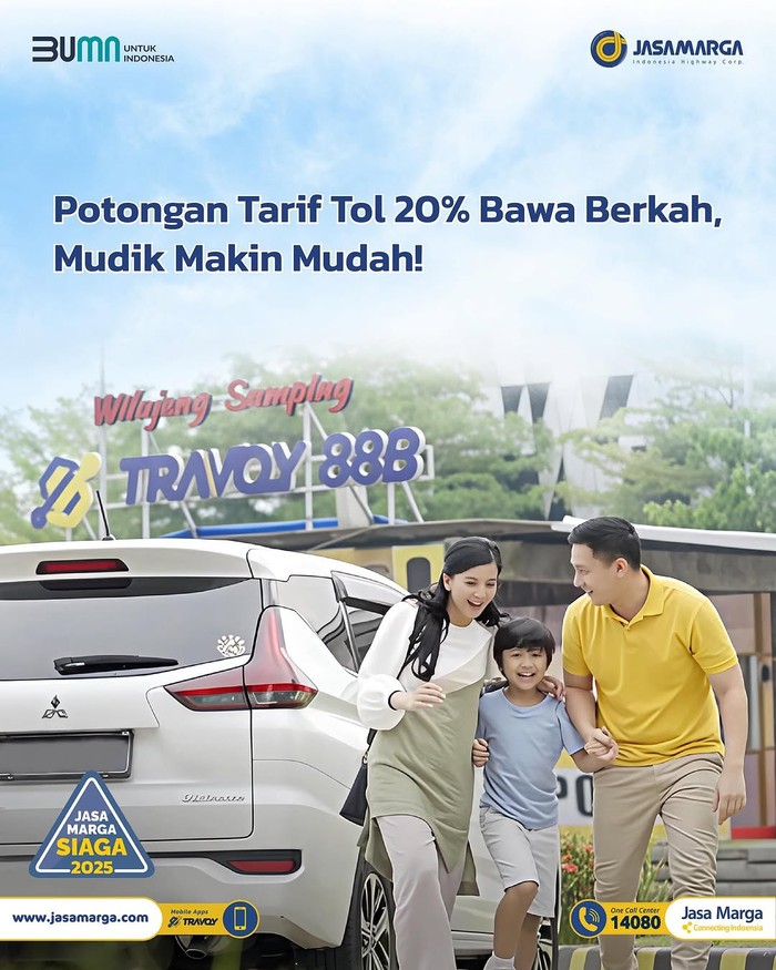 Untuk kamu yang mudik menggunakan kendaraan pribadi, Jasa Marga menawarkan diskon tarif tol sebanyak 20% dalam menyambut arus mudik. Potongan harga berlaku untuk perjalanan menerus Jakarta (GT. Cikampek Utama) menuju Semarang (GT. Kalikangkung). Potongan harga berlaku di ruas jalan tol yang dikelola oleh Jasa Marga Group dan Non Jasa Marga Group pada tanggal 24 Maret pukul 05.00 hingga 26 Maret 2025 pukul 05.00. Diskon tarif tol di ruas jalan tol Jasa Marga Group kemudian akan diperpanjang yaitu pada tanggal 26 Maret pukul 05.00 hingga 28 Maret hingga 05.00.