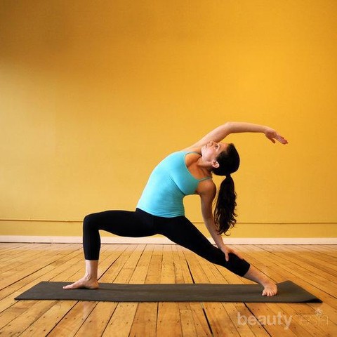 Selanjutnya, dari posisi Warrior Pose II, kamu perlu menurunkan tubuhmu ke arah kiri dan letakkan telapak tangan kirimu pada betis kirimu sehingga pinggang dan punggungmu akan menekuk ke samping kiri. Selanjutnya, angkat tangan kananmu ke atas kepala dan lengkungkan ke arah belakang kepalamu (atau searah dengan kaki kirimu). Tahan posisi ini hingga 5 kali nafas sebelum sembali ke posisi awal. Ulangi gerakan Reverse Warrior ini untuk kaki kirimu. If you’re a newbie in yoga, this pose is a bit difficult, so don’t be so hard on yourself, ladies!