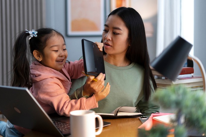 Ilustrasi seorang ibu yang sedang mengasuh anaknya sembari menyelesaikan pekerjaan/Foto: Freepik.com/freepik