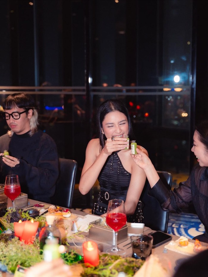 Kemudian di foto selanjutnya, ia tampak mengenakan dress hitam halter yang edgy dan sarat nuansa "fierce" untuk acara makan malam bersama tim. Gaun hitam dengan tumpukan ikat pinggang leather membuat tampilan Mikha tampak stylish. Perpaduan feminin dengan gaya swag yang unik. Kedua outfit malam itu sama-sama merefleksikan karakternya di film, tegas tapi lembut, bold namun tetap effortless.