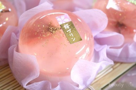 Puding susu dengan lapisan agar-agar berwarna bening untuk menikmati keindahan bunga sakura di dalamnya. Cantiknya!