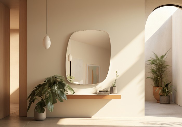 Pilih cermin lantai berbentuk lengkung untuk nuansa modern, cermin bundar dengan bingkai kayu untuk kesan cozy, atau cermin tinggi tanpa bingkai untuk gaya minimalis.