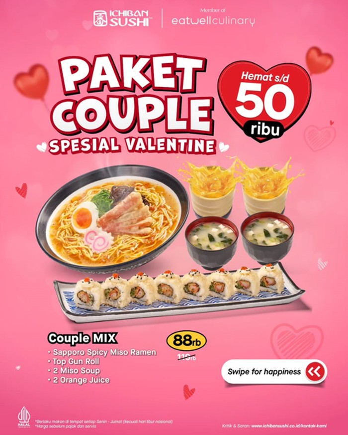 Ichiban Sushi memberikan promo Paket Couple Spesial Valentine. Nikmati pilihan paket couple mix Rp 88.000 (1 Ramen + 1 Sushi + 2 Miso Soup + 2 Orange Juice, Couple Sushi Rp 88.000 (2 Roll Sushi + 2 Miso Soup + 2 Orange Juice), Couple Ramen Rp 99.000 (2 Ramen + 1 Gyoza + 2 Orange Juice).