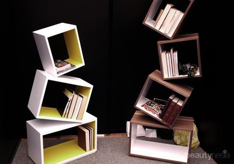 Desain rak buku satu ini sungguh menarik. Balok-balok yang ditumpuk secara acak namun tetap berdiri seimbang.