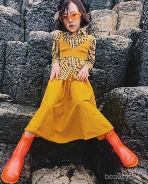 Foto: https://www.instagram.com/annie.khanhan2011Girly namun swag, begini penampilan Annie Khanh An yang berpose di antara batu-batu besar. Dengan menggunakan long dress mustard yang dibalut dengan kemeja yang ditambah cropped top berwarna mustard. Penampilanya semakin chic dengan kacamata retro dan boots yang berwarna orange.