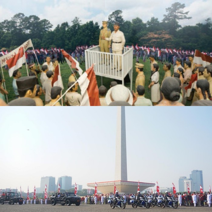 Monas (bawah) dulunya Lapangan Ikada (atas)/Foto: Museum Penerangan, Instagram.com/monumen.nasional