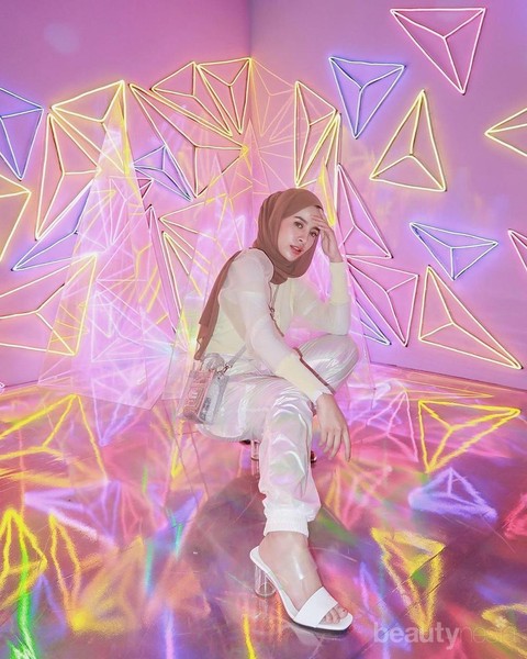 Color and style coordinated! Penampilan yang dipilih Aghnia untuk datang ke sini sepertinya nyambung banget, nih, dengan background foto yang dipilihnya. Memilih baju dengan efek transparan dan mengkilap, hasil foto Aghnia jadi keren banget!