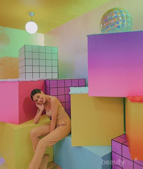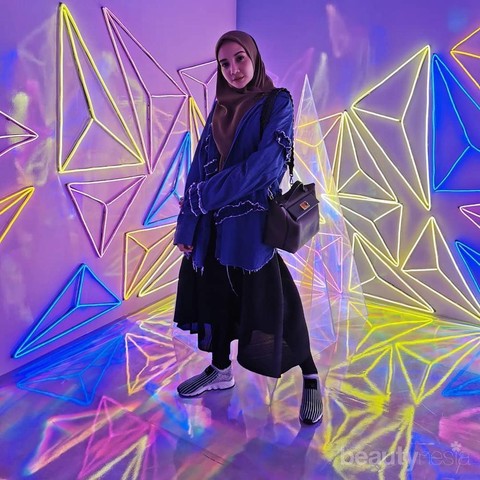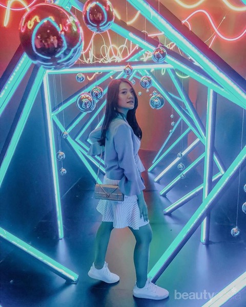 Selanjutnya ada Anissa Aziza yang memilih berfoto di instalasi dengan rona pencahayaan biru dan merah. Ibu muda yang satu ini berpenampilan kasual dengan rok dan sneakers. Kamu tertarik nggak, nih, dengan spot foto Anissa?