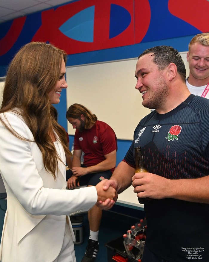 Princess of Wales tampil memukau dalam balutan pakaian putih saat menghadiri Rugby World Cup pada bulan September lalu. Dia mengenakan pantsuit yang cantik terdiri dari celana panjang dengan cutting lebar pada bagian bawah, kemeja putih, dan blazer single-breasted rancangan dari Alexander McQueen. Ini bukan pertama kalinya, Princess of Wales mengenakan busana ini. Sebelumnya Ia pernah mengenakan busana yang sama saat hadir di Commonwealth Games.
