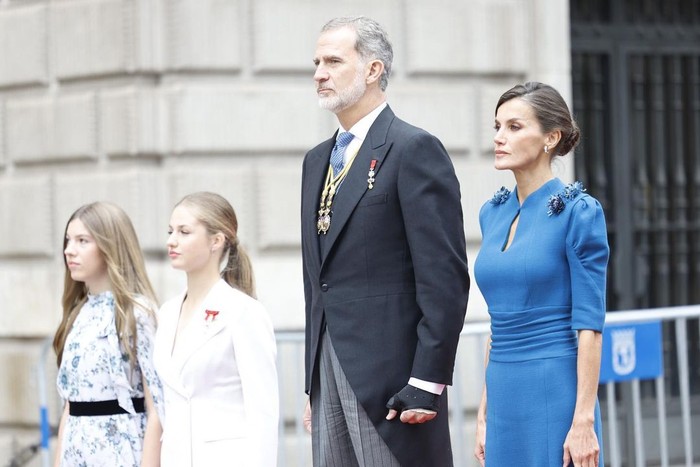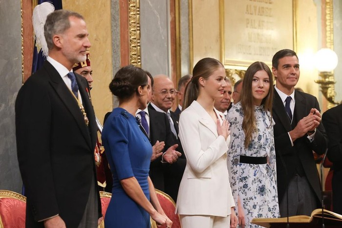 Saat peresmian tahta, Princess Leonor ditemani oleh King Felipe VI, Ratu Letizia dan juga saudaranya Infanta Sofia yang selalu setia di sampingnya. Calon ratu Spanyol ini tampil percaya diri dan anggun dalam balutan busana serba putih.