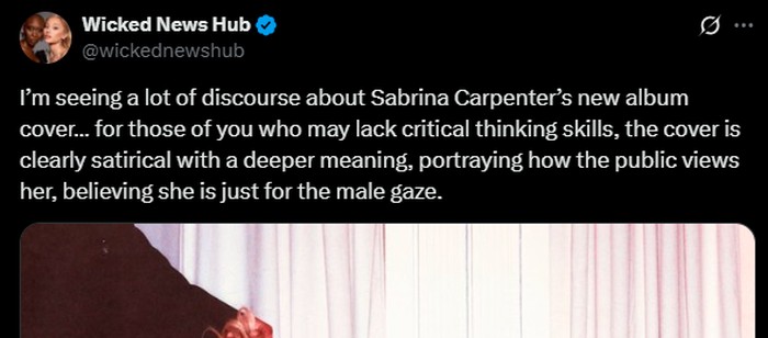 Akun @wickednewshub di X menuliskan, “Untuk kalian yang kurang kemampuan berpikir kritis, cover ini jelas satir, menggambarkan bagaimana publik melihat Sabrina seakan dia hanya objek male gaze.”