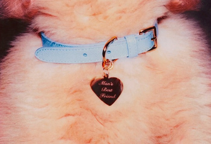 Slide kedua dalam unggahan tersebut memperlihatkan kalung anjing warna biru muda bertuliskan “Man’s Best Friend,” memperkuat tema visual yang provokatif dan mengundang makna ganda.