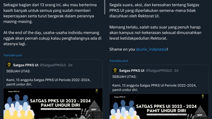 Per tanggal 1 April 2024 kemarin, Satuan Tugas Pencegahan dan Penanganan Kekerasan Seksual (Satgas PPKS) Universitas Indonesia mengajukan pengunduran diri. Pernyataan ini dirilis pada akun X dan Instagram resmi Satgas PPKS UI.
