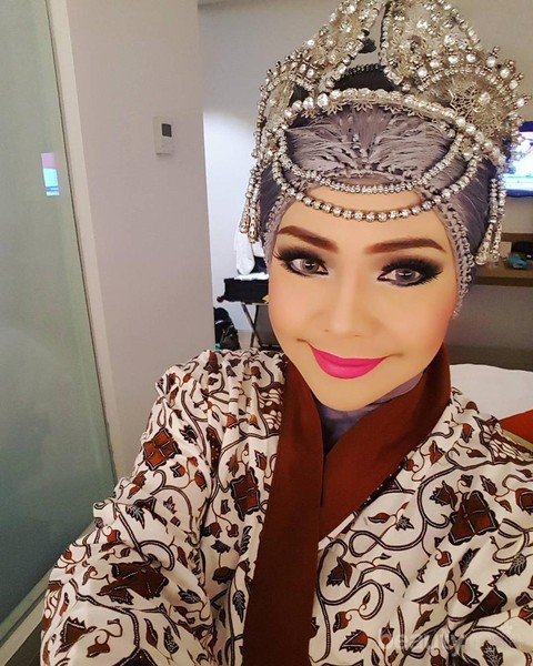 Gaya hijab unik satu ini adalah hijab rambut berwarna silver seperti disanggul untuk memberikan efek feminim dan glamor. Coba lihat make up yang dipakai Iyeth Bustami ini, lagi-lagi ia selalu bermakeup dengan sempurna dan cocok dengan hijab uniknya tersebut. Aksen mahkota dan mutiara warna silver membuat tampilan Iyeth Bustami bak seorang ratu di atas panggung ya. Nah, kamu lebih suka penampilan yang mana nih Ladies?