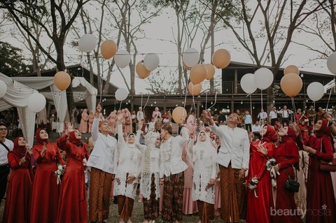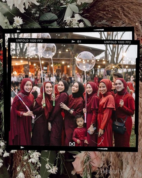 Merupakan suatu keberuntungan bagi Helmi, punya sahabat-sahabat setia yang hadir di momen penting baginya. Foto ini mengabadikan Helmi dan bridesmaid-nya yang kompak berpakaian warna merah maroon. Helmi sendiri berdiri di tengah sebagai pusat. Inspirasi gaya foto dengan bridesmaid, nih, Ladies!
