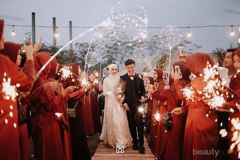 Potret yang pertama ini diambil waktu acara malam, di mana selebgram Bandung yang biasa dipanggil Amy ini mengenakan gaun berwarna putih dengan hiasan bunga merah. Latar belakang langit yang mulai gelap match banget, nih, dengan kembang api yang dipegang para tamu yang berbaris untuk menyambut sang pengantin baru. Bahagianya jadi raja dan ratu sehari, nih, Ladies.