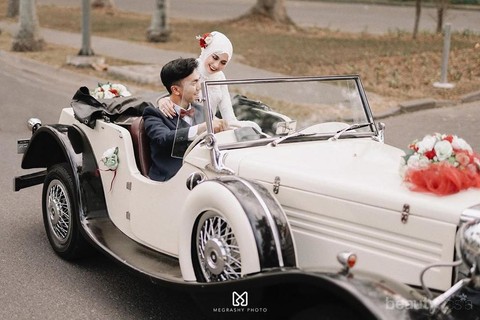 Selanjutnya ada potret Helmi dan Gege sewaktu menaiki mobil pernikahan mereka. Unik dan artistik banget, nih, karena mobilnya terbuka dan warnanya sesuai banget dengan tema yang dipilih. Mereka terlihat siap meluncur menuju hidup baru.