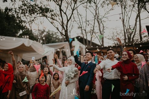 Dalam rangkaian acara pernikahan, salah satu momen yang terabadikan adalah ketika Helmi dan sang suami menerbangkan pesawat kertas warna-warni bersama keluarga dan para tamu yang hadir. Semoga semua harapan dan doanya bisa ikut melambung tinggi, ya.