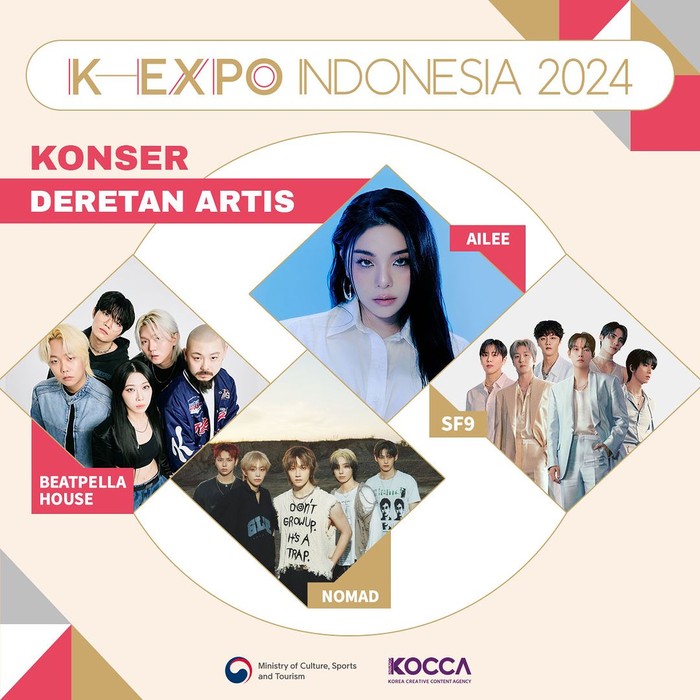 Ailee, SF9, Nomad, dan Beatpella House siap meramaikan festival musik, mulai pukul 18.00 WIB hingga 20.00 WIB. Menariknya, K-EXPO INDONESIA 2024 tidak dipungut biaya, melainkan para penggemar bisa mendaftarkan diri melalui situs k-expo2024.kr/id/ untuk mendapatkan tiketnya.