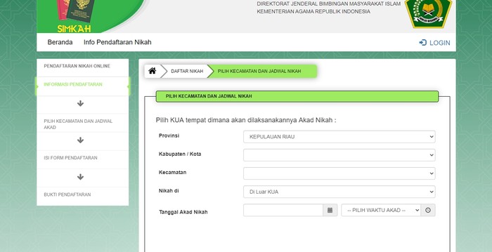 - Pilih KUA tempat dimana akan dilaksanakannya akad nikah. Lengkapi data seperti Provinsi/Kab/Kota/Kecamatan, tanggal dan jam.