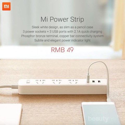 Produk selanjutnya adalah sebuah colokan dengan 3 port USB dengan desain minimalis. Colokan ini memiliki ukuran sebesar tempat pensil. Besarnya listrik yang digunakan adalah 2.1A dan dilindungi dengan soket pengaman untuk menghindari korsleting. Mi Smart Power Strip ini juga tidak mudah terbakar. Harga yang dibanderol adalah 49 yuan atau lebih dari Rp 100 ribu.