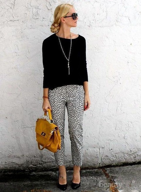 Gaya simpel selanjutnya, kamu bisa memakai printed pants yang kamu punya! Pilih corak seru dan simpel, seperti polkadot ataupun stripes, dengan warna yang netral (hitam, biru navy, atau coklat misalnya) agar kamu tidak terlihat terlalu heboh. Padukan dengan atasan simpel dan heels atau flat shoes serta hand bag favoritmu.