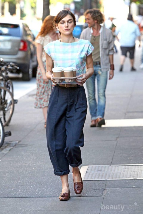 Kalau kamu suka gaya fashion yang sederhana, kamu wajib mencontoh Keira Knightley, ladies. Si Cantik satu ini selalu tampil sederhana dalam kesehariannya. Ia hanya mengenakan 1 atasan yang dimasukkan ke dalam celana atau rok, sepatu, tas simple, serta mempercantik tampilannya dengan ikat pinggang. Bawahan yang digunakan Keira, baik celana panjang ataupun rok, kebanyakan berjenis high waist dengan tambahan ikat pinggang. Ini tips yang oke banget buat kamu, nih. Why? Karena cara satu ini akan membuat tubuh kamu terlihat lebih berlekuk dan menjauhkan fokus orang lain dari area dada kamu. It’s practical, isn’t?