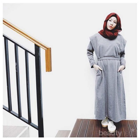 Foto: https://perempuan.com/Perapduan warna abu-abu yang lembut dipadukan dengan merah untuk hijabnya sangat pas tanpa terlihat mencolok.