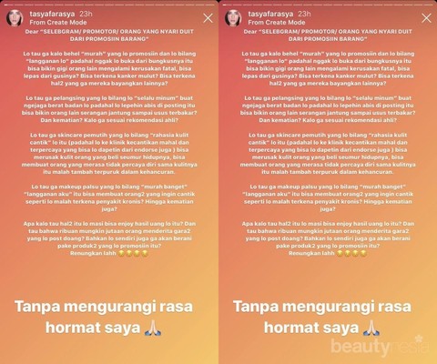 Resah dengan banyaknya selebgram dan influencer tak menyaring produk endorse. Tasya Farasya lakukan protes dalam story Instagramnya.