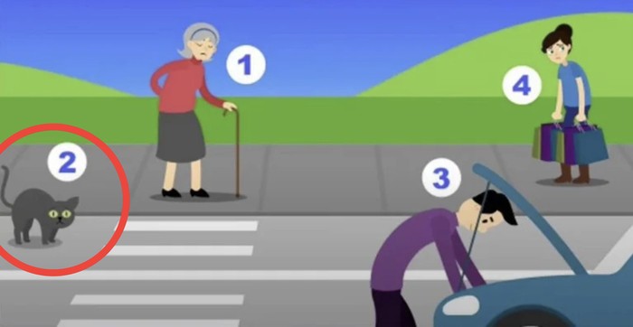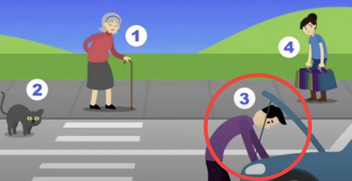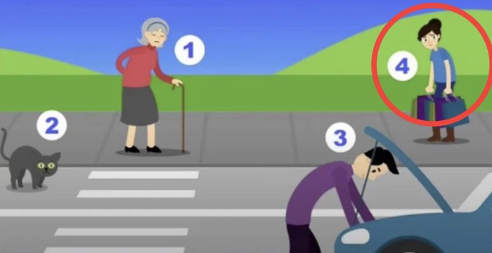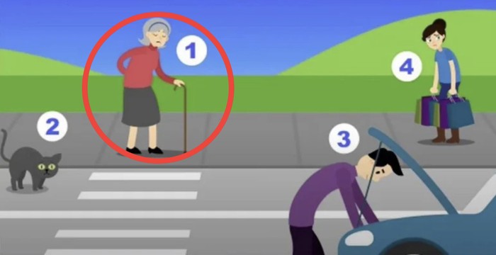 Dalam gambar tersebut, ada nenek yang hendak menyeberang jalan, seekor kucing di pinggir jalan, seorang perempuan membawa banyak belanjaan, dan seorang pria dengan mobil mogok. Tanpa berpikir panjang, siapa yang paling dulu menarik perhatianmu?