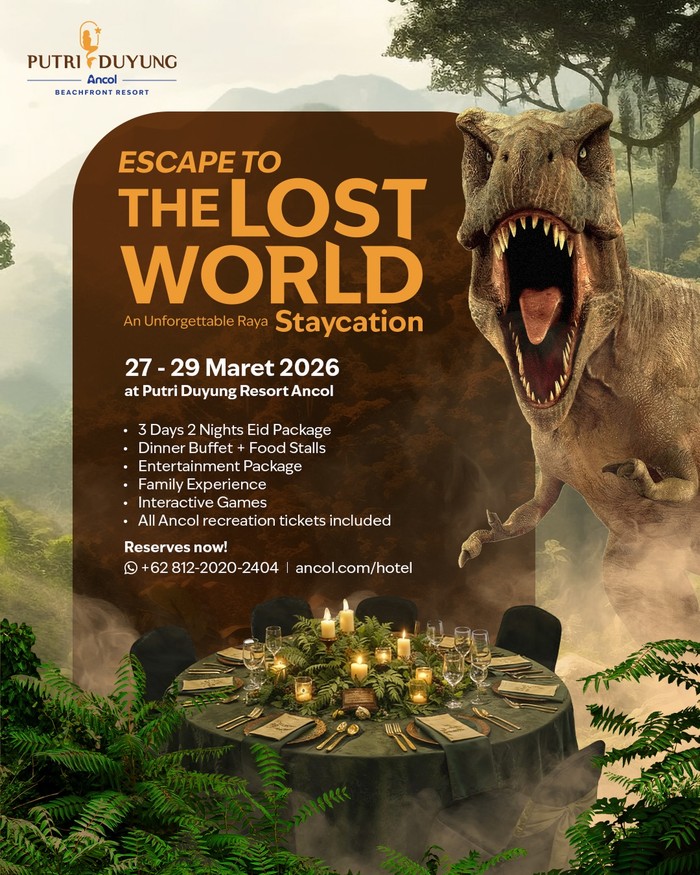Putri Duyung Ancol menghadirkan paket spesial dengan tema “Escape to the Lost World”. Paket ini menawarkan pengalaman menginap dengan nuansa hotel resort tropis yang berada di kawasan Taman Impian Jaya Ancol dengan menginap di cottage tepi laut, sehingga kamu bisa menikmati pemandangan pantai serta suasana liburan yang santai. Selain itu, terdapat berbagai fasilitas menarik seperti infinity pool yang menghadap laut, area playground anak, jogging track di tepi pantai, hingga penyewaan sepeda untuk berkeliling di kawasan resort.
