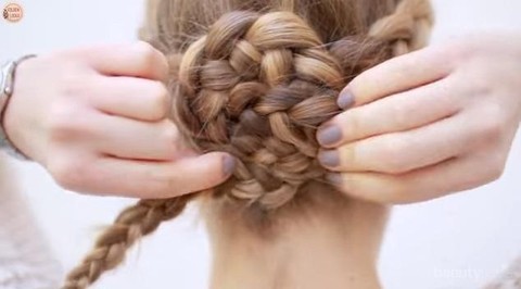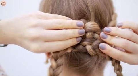 Gulung sisa rambut kepang yang menjuntai ke bawah mengelilingi sumbu yang telah kamu buat dengan menyilangkan rambut kepangmu.