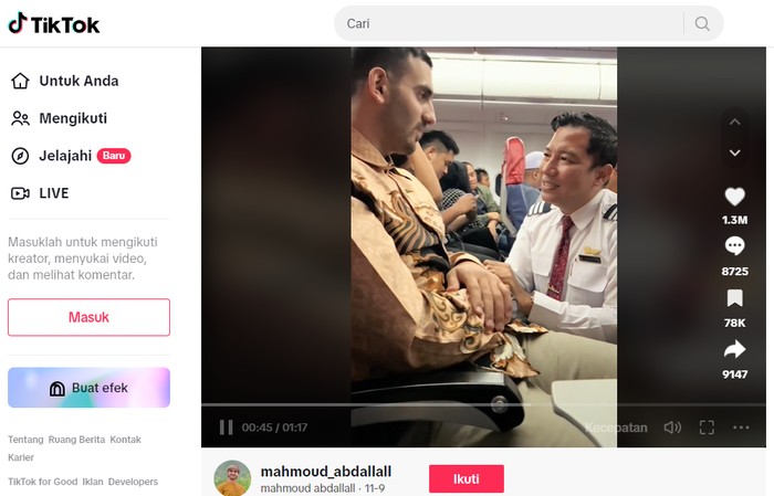 Momen mengharukan pilot Indonesia peluk penumpang Palestina di pesawat/Foto: TikTok/@mahmoud_abdallall