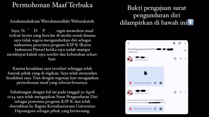 Ia juga menyertakan bukti tangkapan layar bahwa ia telah mengirim surel pada bagian kemahasiswaan kampusnya yang berisi surat pengunduran dirinya dari penerima KIP-K.