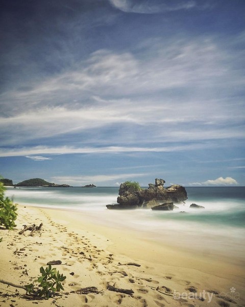 Pantai ini membujur dengan panjang sekitar 800 meter dan termasuk salah satu tempat wisata Malang terbaru murah yang wajib kamu kunjungi. Pasirnya berwarna putih bersih dan sangat halus. Di tempat ini, terdapat bebatuan berlumut, terumbu, dan kerang-kerang di sekitar pantainya.