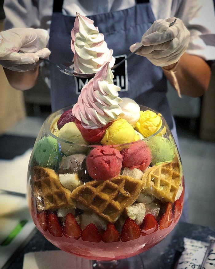 Restoran bernama ‘MO & MOSHI’ yang berlokasi di Siam Centre, menyediakan menu es krim parfait raksasa dengan lapisan es krim berbagai rasa, dan aneka topping seperti stroberi, waffle, pocky, biskuit, cokelat, dan lainnya, dalam satu wadah super besar.