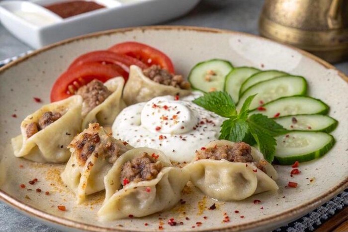Perpaduan cita rasa gurih dan rempah yang kuat, berpadu dengan tekstur lembut karena diolah dengan dikukus atau direbus. Manti biasanya disajikan hangat dengan saus campuran yogurt, bawang putih, daun mint, cabai bubuk, dan mentega cair.