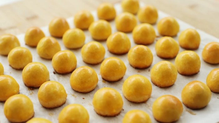 - Masukkan isian selai nanas, bentuk bulat lalu simpan ke dalam loyang yang sudah dialas dengan baking paper.