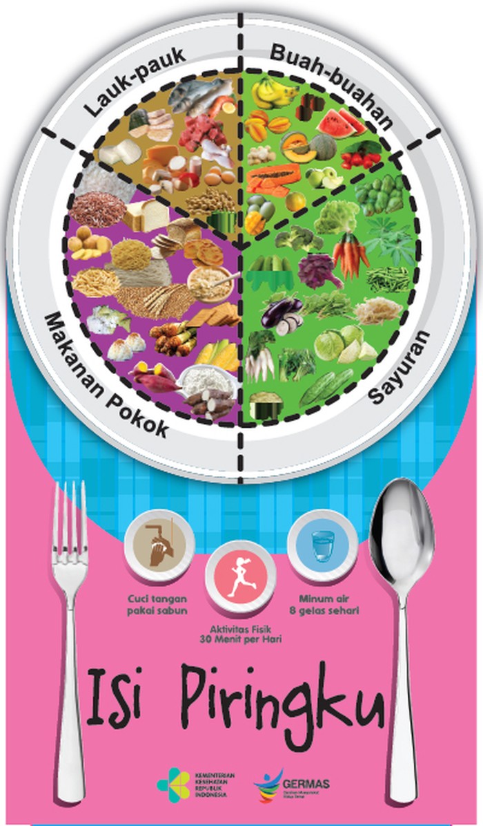 Isi Piringku menjelaskan bahwa dalam satu piring tersebut berisi 50% buah dan sayur, 50% karbohidrat dan protein. Jangan lupa untuk minum 7-8 gelas air putih per hari untuk hidrasi tubuh yang harus dipenuhi.