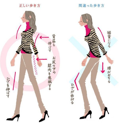 Gambar sebelah kiri adalah posisi berjalan yang benar. Tubuh tegap, kaki lurus dan menapak dengan baik. Sedangkan gambar sebelah kanan adalah cara berjalan yang tidak baik. Punggung agak membungkuk, kaki terlalu menekuk sehingga pantat menjadi turun. Jika Minasan tidak ingin pada saat tua nanti berjalan dengan membungkuk, sebaiknya hentikan kebiasaan buruk ini.