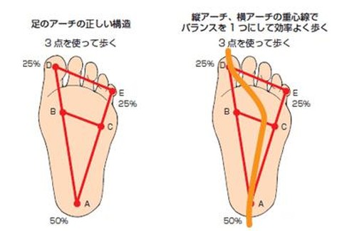 Saat sedang berjalan, tumpuan saat menapakkan kaki ke permukaan tanah bukanlah tumit saja. Akan tetapi dalam waktu yang bersamaan tapakkan tumit, jari kelingking, dan ibu jari ke atas permukaan tanah.https://www.ashiuratengoku.co.jp/000site/hokou/11.html |