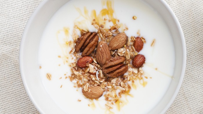 - Siapkan mangkuk, masukkan oatmeal ke dalam mangkuk, lalu tuang susu rendah lemak secukupnya.