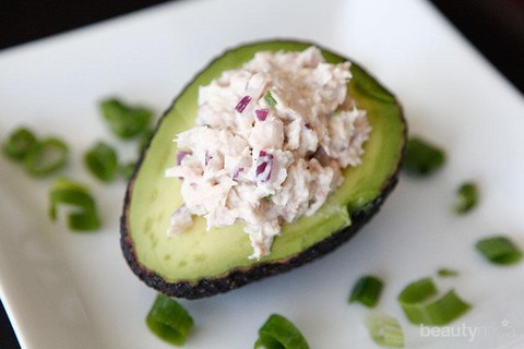 Dalam hidangan ini, buah alpukat menjadi dasarnya. Kupaslah buah alpukat secara utuh dan bagi menjadi 2. Buanglah bijinya dan kamu bisa menambahkan chicken salad yang sudah dibuat dengan campuran yogurt. Yummy!