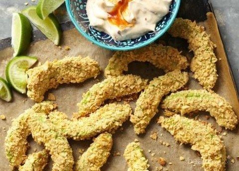Kalau kamu suka makan yang crispy, kamu pasti suka makan alpukat crispy ini. Kamu bisa membuat sendiri di rumah dengan bahan yang segar. Potong alpukat memanjang seperti bentuk kentang goreng. Balur dengan tepung roti dan goreng hingga matang dan renyah. Sajikan dengan saus cocolan shiracha yang bercita rasa bawang putih.